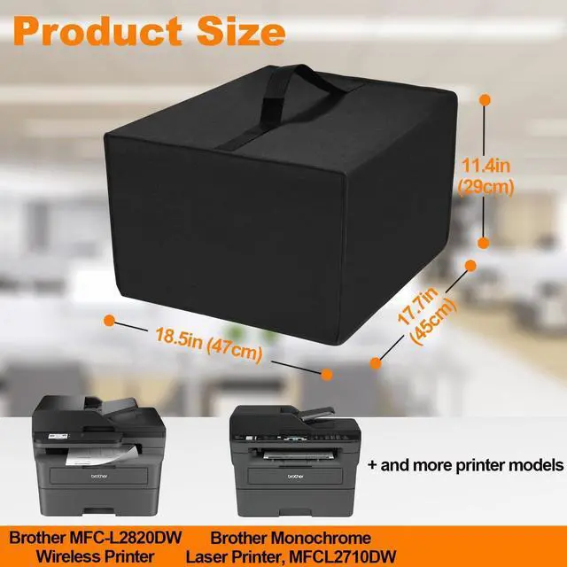 Compatible Models: Fits printers up to (DWH) 18.517. 711.4 inches (474529cm). Printer cover perfectly compatible with Brother MFC-L2820DW Wireless Printer and Brother MFCL2710DW Wireless Monochrome Printer, and other similarly sized appliances.