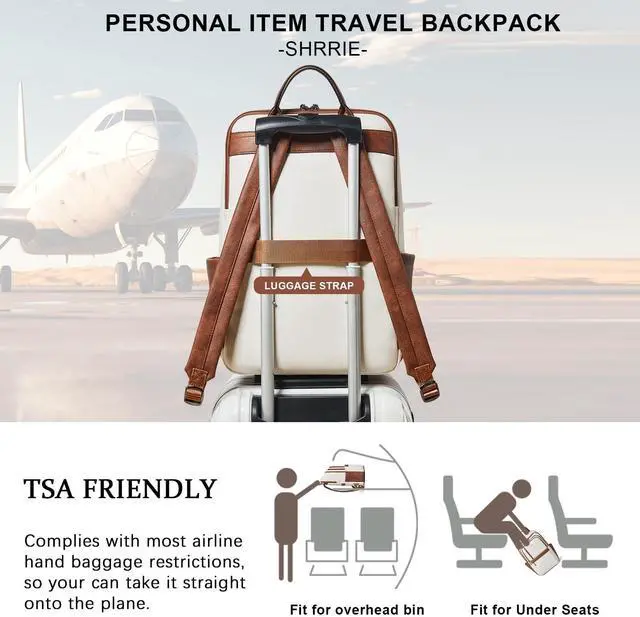 PREMIUM MATERIALSShrrie Laptop Backpack for Women crafted from premium, soft, and durable waterproof PU leather. It features a high-quality fabric lining, robust metal hardware, smooth zippers, and exquisite craftsmanship. With reinforced stitching and a waterproof design, it's a reliable choice for commuting, hiking, or getaways. Furthermore, its simple and unisex design makes it not just a women's backpack, but also a perfect laptop bag for anyoneeven as a stylish couple's bag. ^^ Independent Laptop Bag The vegan leather backpack purse size is 12.6 " (L) x 7.9 " (W) x 17.7 " (H) and weight: 2.2 lbs. It features a zippered compartment with a dedicated, padded divider for your 17-inch laptop. Its versatile design makes it suitable for a variety of situations, suitable for use as a student backpack, business backpack, work backpack, airport backpack, travel backpack or everyday fashion backpack, helping you to keep your belongings organised. ^^ Practical Backpack Luggage Strap DesignThis 17 inch laptop backpack is designed for travel, helps free your hands and alleviates back strain, enhancing comfort and convenience on the go. As a compact, waterproof carry-on, it easily fits under airplane seats and complies with standard airline size requirements. Leather backpacks may have a slight odor. Simply leave it in a well-ventilated area for 23 days and the smell will fade. ^^ Multi-Compartment DesignOur travel backpack for women with 13 pockets, the main double-zippered compartment features an inner zipped pocket, two slip pockets and a padded for electronics. On the outside, there is a laptop compartment zipped pockets, three front zipped pockets, two big zipped pockets and two cup pockets. There is ample space for your laptop, mobile phones, books, iPads, A4 documents, umbrellas, power bank, glasses, cosmetics and clothing.