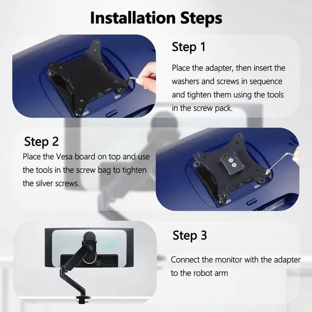 ^^ Universal VESA Support: Compatible with Alienware Monitor VESA Mount Adapter is the ideal accessory for users. It Solved the installation problem of monitors with only VESA 100*100 holes and is fully compatible with 75x75mm or 100x100mm VESA Various robotic arms Say goodbye to limited mounting options! ^^