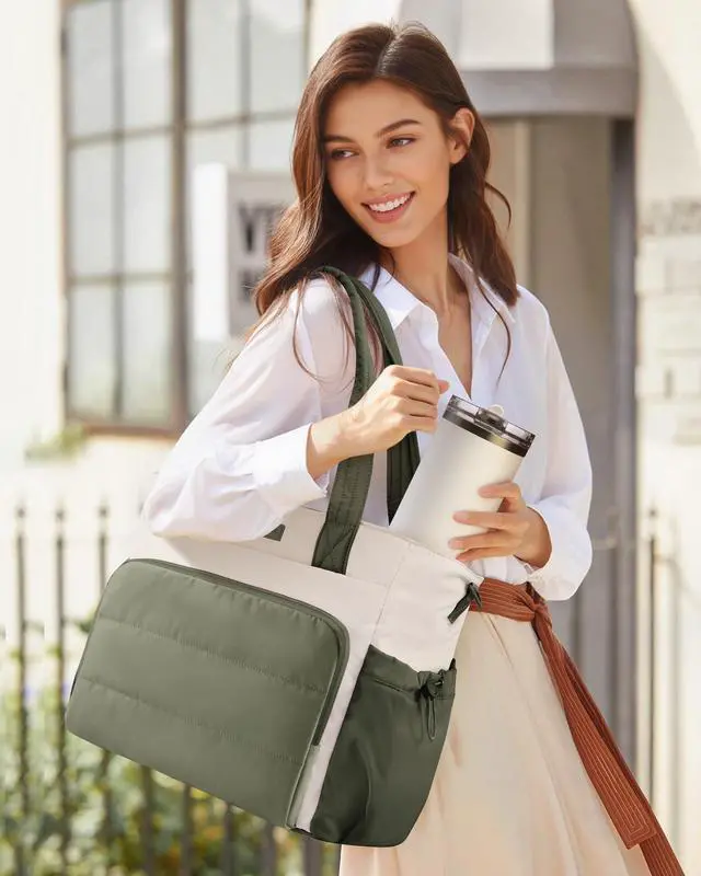 DaySwitch up your style: use the extra-long top handles for a sleek look, attach the detachable strap for hands-free comfort, or slide it over luggage with the back sleeve. Perfect for work, travel, and weekends. ^^ Tough Yet Totally WashableCrafted with lightweight LOVEVOOK composite fabric, this bag resists scratches, shrugs off stains, and stays in shapeeven after countless machine washes. Looks new, trip after trip. ^^ Style Meets FunctionFrom the office to the gym to a weekend getaway, this sleek puffer tote blends modern style with everyday function. A perfect gift for professionals, moms, and travelers!