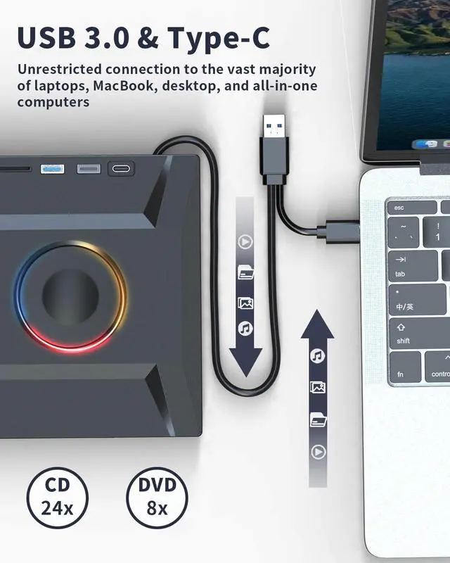 Note: Not compatible with ChromeOS (Chromebooks), iPads/tablets, TVs, vehicles (cars/trucks), some Surface models, or Blu-ray/4K discs. ^^ 7-in-1 Design with Multi-Function Hub- The external drive can not only burn and read CD DVD, but also can be used as a external laptop usb hub, including 2 USB 3.0 port, 1 USB 2.0 port, 1 TF slot, 1 SD card slot and 2 USB C Port, compatible with usb hard drive, limited/wireless mouse & keyboard, computer radiator and other usb computer accessories, The card slot are perfect for transferring photo and video files by your camera from cards to your computer(Note: SD port and TF port cannot be used at the same time). ^^ Slim, Portable & User-Friendly Design- Crafted with a lightweight, ultra-slim profile and a non-slip rubber base, skip-proof rubber pad prevents sliding on the desktop, and the embedded data cable is easy to use and organize, this drive is both compact and stable. Its integrated cable ensures easy transport and storage, making it an ideal companion for work, travel, or preserving your favorite CD and DVD collections.