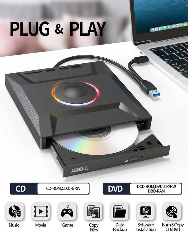 EXTERNAL CD DVD DRIVE FOR LAPTOP- Are you still worried about your computer not having a driver? The external dvd drive that ASHDOL newly released is a good solution. No need for additional drivers. plug and play. The CD Rom external cd drive for laptop has strong error correction, anti-skid and quiet capabilities. ^^ USB 3.0 HIGH SPEED DATA TRANSFER- CD Burner with high speed USB 3.0 and Type-C technology, many of the port cluster connectors backward compatible with USB 2.0 / 1.1. Experience rapid data transfers with advanced USB 3.0 technology, which is approximately 10 times faster than USB 2.