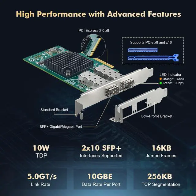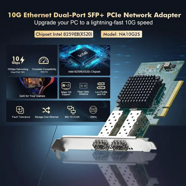 Dual Port 10Gbps 2 Port 10 Gigabit SFP+ Port with Intel X520 82599 chipset, compatibe 1G/100/10Mbps, 2* Open SFP+ slots for SFP+ SR, SFP+ LR modules and direct attach SFP+ cables. *default without modules* ^^ PCIe Slot x8PCI Express 2.0 ( 5.0GT /S) bus, compatible for PCIe slot X8, X16, default with standard bracket, also include low profilce bracket, support multiple installation such as PC, server, workstation, NAS, etc. **not for PCI slot** ^^ Multiple OSSupport Windows 7/8/10, Server 2003, 2008, Linux, FreeBSD, VMware ESX, freely driver download, CD-ROM, manual Binardat/Intel official website can download the driver easily.