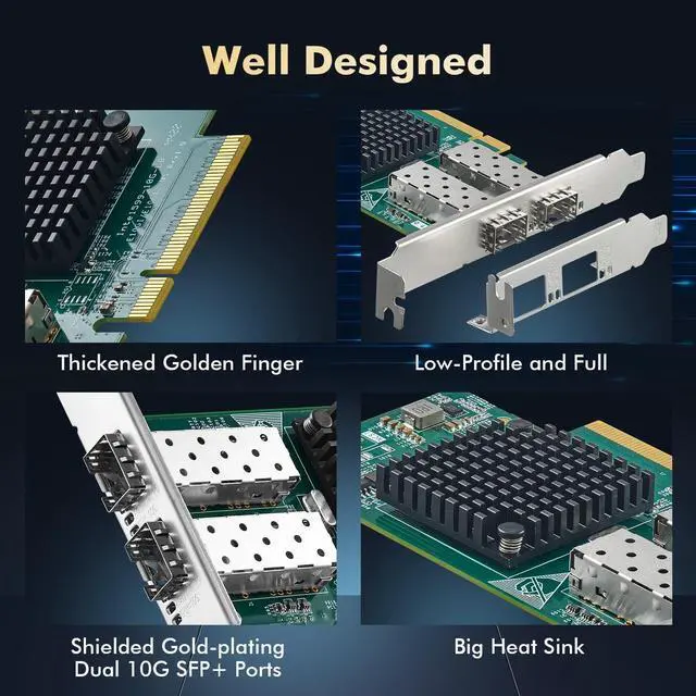 ^^ Network FeatureIEEE 802.3 (1000BASE-SX, 1000BASE-LX, 1000BASE-ZX), LC, Intel Virtualization Technology for connectivity, IPSEC/LinkSec security ^^ Easy to UseSelect the appropriate brackets according to the chassis size, insert into the PCIe slots, install the driver, connect to the network, the LEDs show the link status and rate. Any questions, please contact our support email, we will provide timely service.