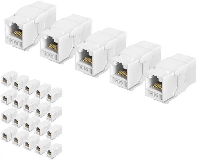 The Jadaol 25-Pack RJ45 Cat6 Keystone Coupler is an essential solution for expanding your network, allowing you to seamlessly connect two Ethernet cables with stable, high-speed data transfer rates of up to 10Gbps. Crafted with gold-plated contacts and durable, flame-retardant ABS housing, these couplers offer long-lasting performance, ensuring both safety and reliability. Their compact design is perfect for multi-port wall plates and high-density patch panels, making them ideal for home, office, and server room network setups. Featuring a tool-free installation, these couplers snap easily into standard wall plates and patch panels, eliminating the need for crimping or punch-down tools.