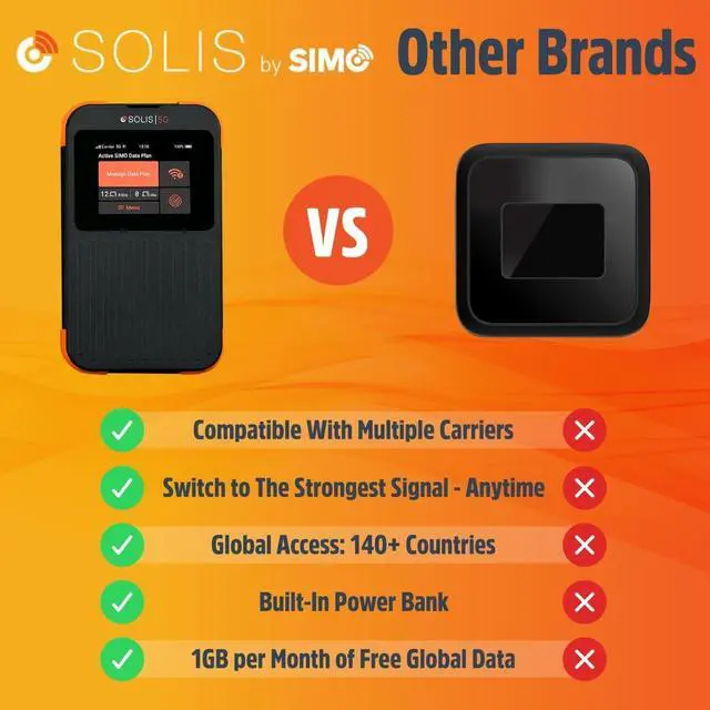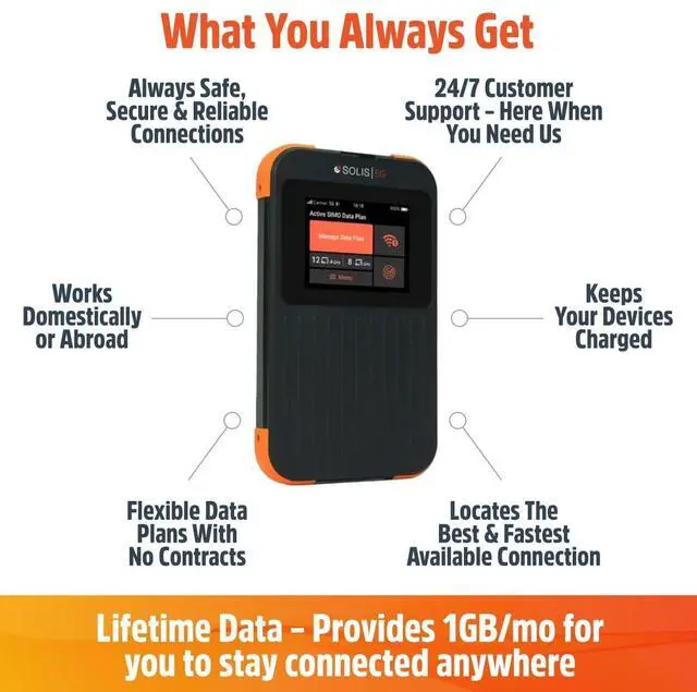 Use: Simply download the Solis app and register your device; start using your Lifetime Data plan or add an additional WiFi option to safely and privately connect to available signals