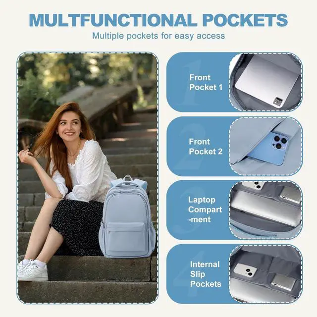 Zipper closure ^^ Breathable shoulder pad ^^ Large Storage Space The Backpack has large -capacity main pocket x1, laptop computer pocket x1, front zipper pocket x2, side pocket x2. The spacious compartments and multiple pockets make your items well-organized and easier to find.