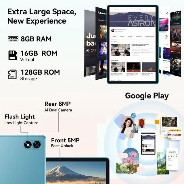 WiFi & BT 5.0: This Android 15 tablet supports high-speed AC 2.4G /5G Wi-Fi and BT 5.0 to keep your communication and entertainment on the go. It also comes with a 3.5 mm headphone jack and supports split-screen, wireless transfer, auto wake-up, face recognition, low battery alert and FM radio. Making your experience safer and more comfortable