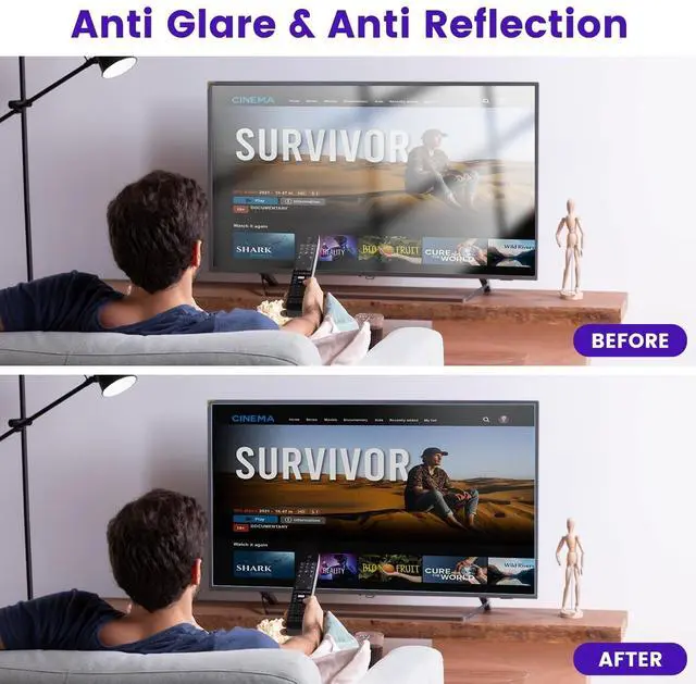 Compatible Model Length: 27.48" (698 mm), Width: 15.43" (392 mm), Diagonal: 32" (812 mm). This TV screen protector is compatible with all 32" TV brands with a 16:9 aspect ratio. ^^ Advanced Blue Light Filtering Technology This 32 inch anti glare tv screen shield features a 9-layer coating to help reduce blue light exposure for more comfortable viewing ^^ Superior Anti-Glare Technology This anti glare computer screen cover 32 inch utilizes advanced anti glare technology to effectively reduce glare and reflections caused by sunlight or bright environments ^^ Effortlessly Enjoy Touchscreens Touchscreen-compatible design preserves touch sensitivity while reducing glare. It's compatible with all major touchscreen laptops and won't affect the way you use your device ^^ Scratch Resistant Design Equipped with advanced scratch-resistant properties, this 32 inch anti glare tv screen protector effectively safeguards your screen from scratches and damage. The smooth surface minimizes fingerprints and smudges, making it easy to clean ^^ Ultimate Viewing Experience This 32 inch tv blue light screen protector maintains the clarity and high-definition quality of your display with its high light transmission. High light transmission maintains display clarity for vibrant colors and sharp visuals ^^ Suitable for Various Users Ideal for extended screen use in brightly lit environments, enhancing viewing comfort.