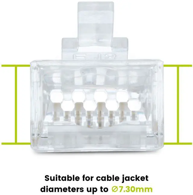 Supports Power over Ethernet: PoE/PoE+/PoE++ (IEEE 802.3 af/at/bt) 4PPoE up to 100W. ^^ [Versatile] Works with 23AWG stranded or solid conductors. Suitable for cable jacket diameters up to 7.30 mm and conductor insulation diameters from 1.05 - 1.15 mm. Terminate with our All in One Crimp and Termination Tool. ^^ [Premium Quality] ANSI/TIA 568 2. D Certified and Validated with trueCABLE U/UTP Ethernet cable. ETL, UL, SGS (RoHS REACH / SVHC) Verified and Tested. FCC compliant. ^^ [Resealable Bag] These transparent gold plated RJ45 plugs are sure to make your install hassle free.