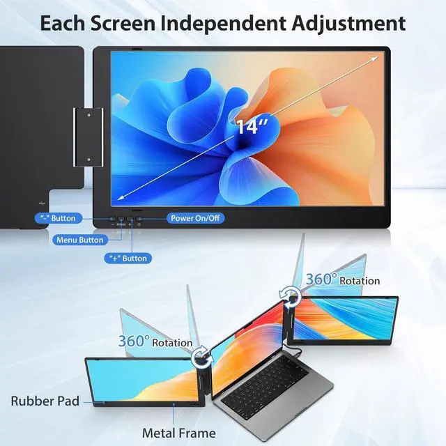 The portable screen extends your laptop to multi-screen synchronization and multi-screen differential display, allowing you to handle different tasks at the same time. Stay organized and easily manage multiple applications and windows on a single laptop by using a triple-screen monitor to up to 300% efficiency. ^^ [ Powerful & Easy Operated Laptop Screen Extender] The USB-C monitor is 0-360 multi-angle foldable for each. Fold two screens reverse closer together for presentation during meetings to share the monitor with colleagues at work. The monitor extender comes with a built-in kickstand for max 90angle adjustment to gain different view angles.