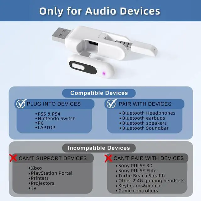Note: aptX-LL feature requires supported headphones. ^^ Plug and PlaySimply connect the Bluetooth audio adaptor to your console, set your headphones to pairing modethey'll connect instantly. After the first use, your headphones will auto-reconnect every time. ^^ High-Quality AudioSupport aptX-HD, aptX-AD, aptX-LL, aptX, and SBC codecs to meet a variety of audio demands. The included 3.5 mm mic maintains clear sound, balancing gaming and chatting for a superior experience. ^^ IMPORTANT NOTICEWhen using UT02 with PS5, the PS5 microphone is supported. The UT02 microphone functions as a backup only if the PS5 mic is unavailable.