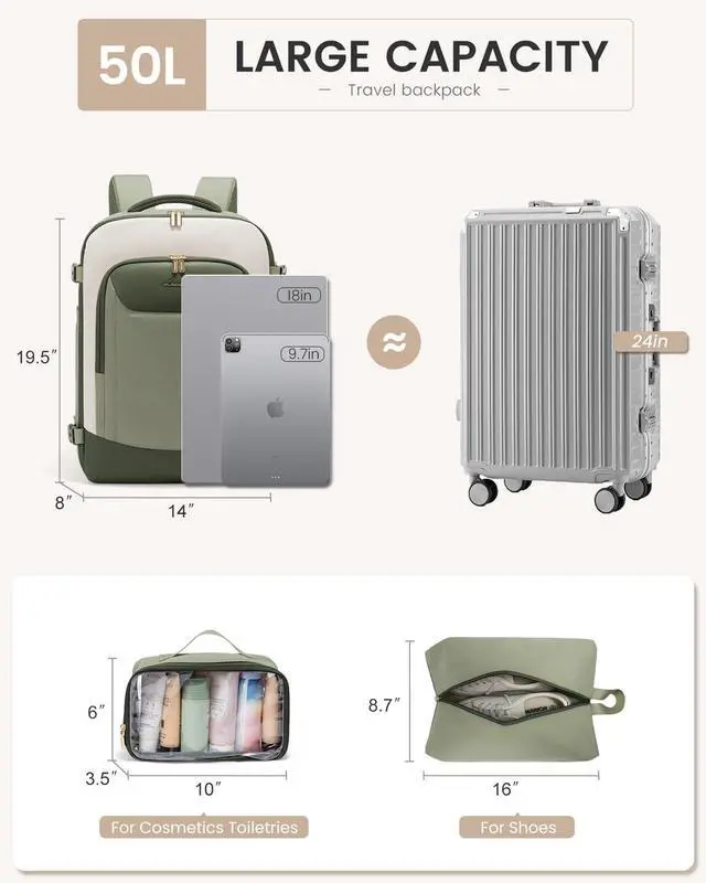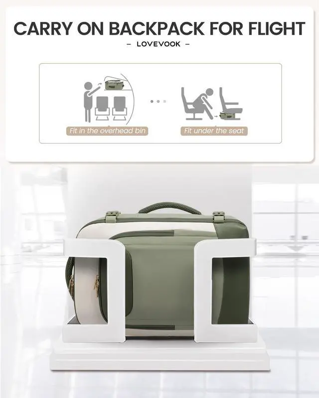 Versatile & Airline-ApprovedMeasuring 19.5 x14x8 inches, this TSA-approved airplane backpack fits most budget airlines (Spirit, Frontier, JetBlue, EasyJet, etc), and easily slides under seats or into overhead binsthe perfect personal item for hassle-free flights. ^^ Spacious & Well-OrganizedWith 50L capacity, this travel backpack features 4 main compartments and multiple pockets for effortless organization, plus a built-in elastic band to secure travel items. Perfectly fits 3-7 days of travel essentials. ^^ 2 Packing Cubes & Wet PocketLOVEVOOK carry-on bag includes a toiletries bag and shoe bag, plus a water-resistant wet pocket to separate damp items (like wet swimwear/towels) and prevent leaks - making it an ideal weekend overnight bag.