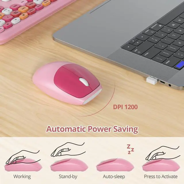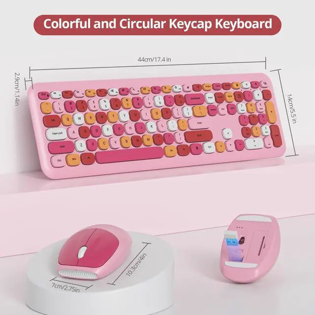Chocolate key: The sweet and lovely color mixing brings you visual enjoyment and adds a touch of colorful fun to your life. Turn your boring desk into a place you enjoy working on. The rounded keycaps design is more suitable for wrist typing height, while the buttons are silent, light, and fast, making this a great cute keyboard and mouse wireless combo ^^ Quiet Tapping and