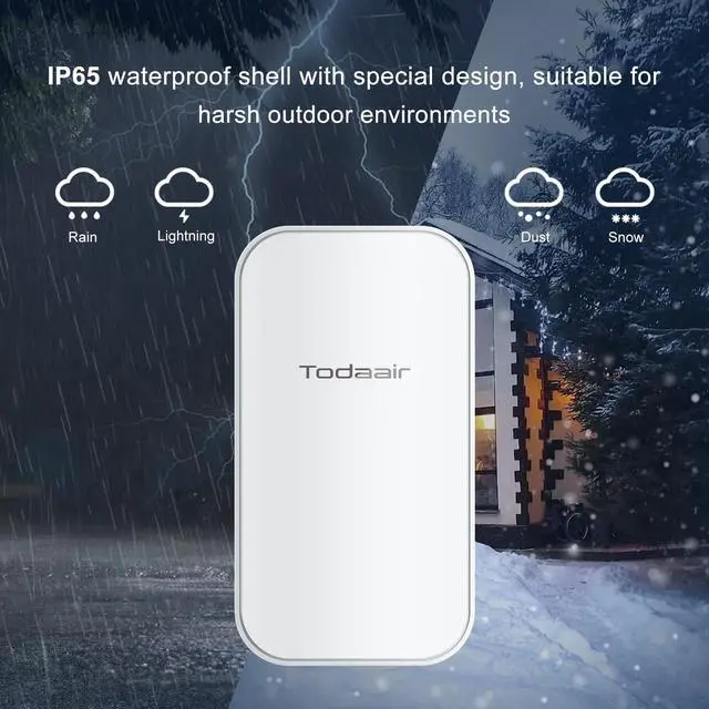 Which can easily meet different needs. ^^ OUTDOOR WATERPROOFTODAAIR WiFi Extender adopts Ip65 waterproof housing, lightning protection, waterproof, dust, antifreeze, high temperature resistance, anti-corrosion, Ensure stable operation in harsh environments or cold, hot climates. ^^ GOOD COMPATIBILITYCompatible with all mainstream routers on the market. Support repeaters modeRepeater mode supports turn-wired and wireless, network ports support computer and television. ^^ EASY TO SETUP & PRO TECHNICAl TEAM SUPPORT If you have any questions during the installation process, you can open the installation video below the window picture to watch. Pls contact us when you meet problems when using WiFi Extender, our Technical Team will help you fix it asap.