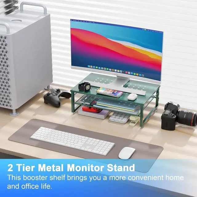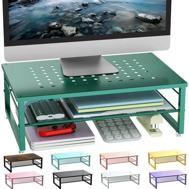 Broad Compatibility: The monitor stand riser has a universal size design that is compatible with printers, computers, Telephone and laptops. It features a ventilated design to prevent overheating. The non-slip rubber pads provide stability during use. ^^ Practical and Stylish The laptop stand has a simple yet sophisticated dual-layer design, providing ample space to store various office supplies, keeping your desk tidy. This allows you to work more efficiently in a comfortable and organized environment. ^^ Sturdy and Stable The monitor riser is constructed with a 15.7 * 10.2 inch metal plate and thick steel legs, with a maximum weight capacity of 44 lbs, enabling it to stably support a variety of items.