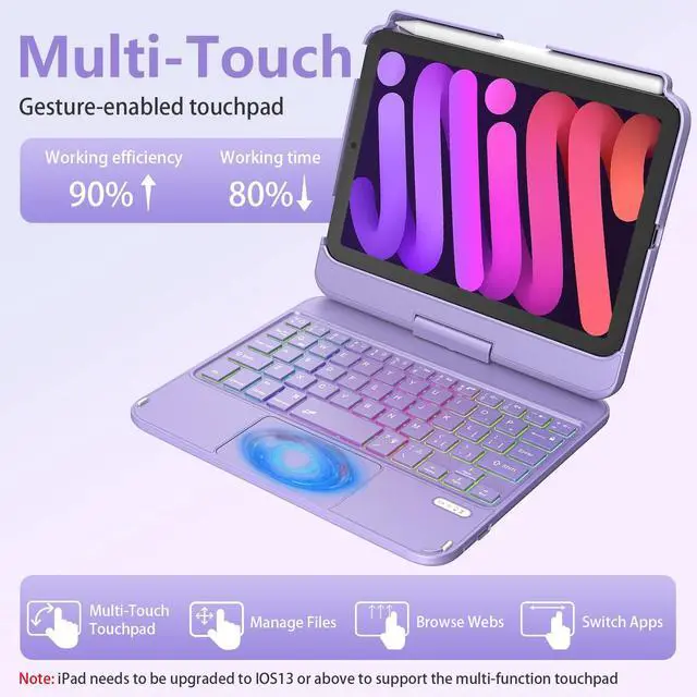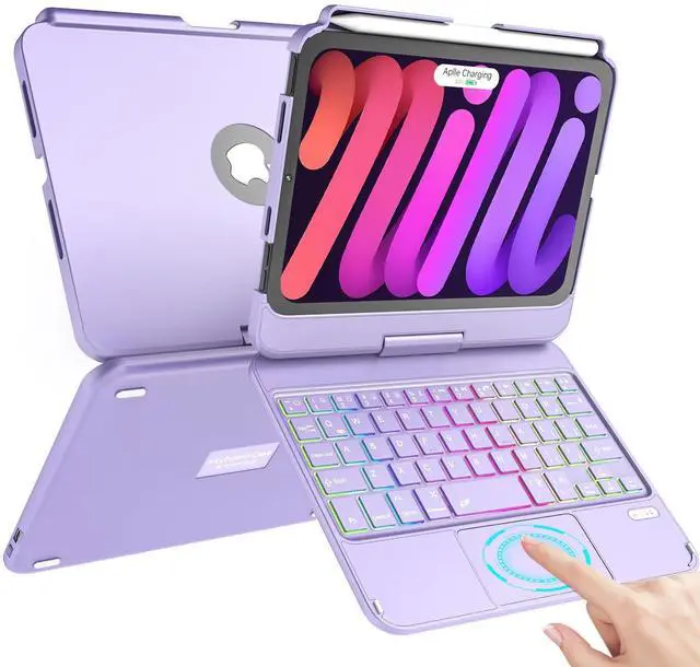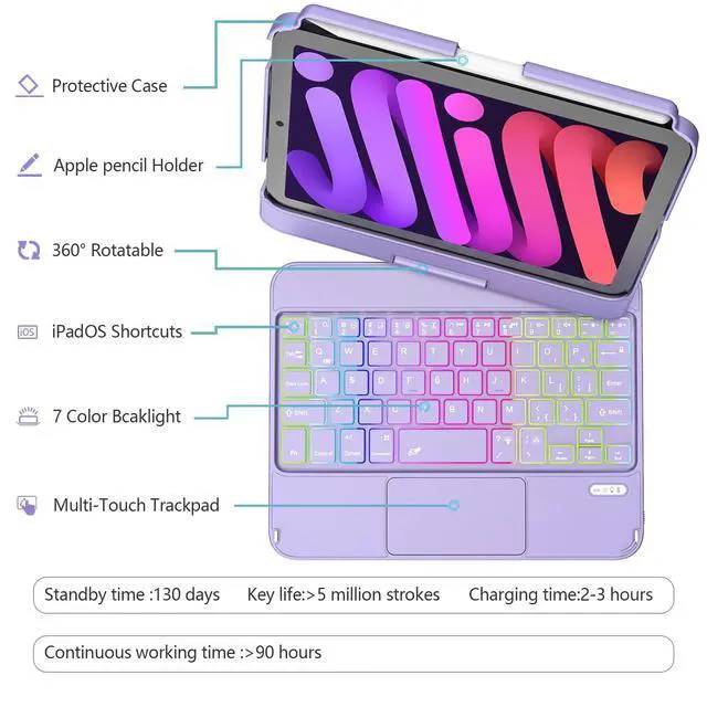 Model Number: A2996/A2995/A2993/A2567/A2568/ A2569. It is NOT compatible with any other devices; Please check back bottom of iPad to find the model number ^^ 7-Color Backlit KeyboardThe premium keyboard case for iPad mini 6th generation has 7 backlight colors and 3 brightness levels to adjust, light up the keys in the dark or dim light, provides you a comfortable typing experience. With iPadOS shortcuts, adjust backlight colors, brightness levels, volume control, media control, and more ^^ Touch Keyboard for iPad Mini 6th GenIntegrated multi-touch trackpad with plentiful trackpad gestures, you can turn your tablet into a highly performant and easy to use laptop! Like swipe and scroll to navigate Mini 6th Gen even faster, that opens up new ways to work with your tablet. Delivering a comfortable user experience while allowing you to click and swipe through content effortlessly ^^ View from Multiple PerspectivesWith new and unique design, layered appearance and more convenient to use, 360 swivel & 180 flip case, your tablet screen will have multiple viewing angles. You can display your work presentation, watch your favorite show or read a new book.
