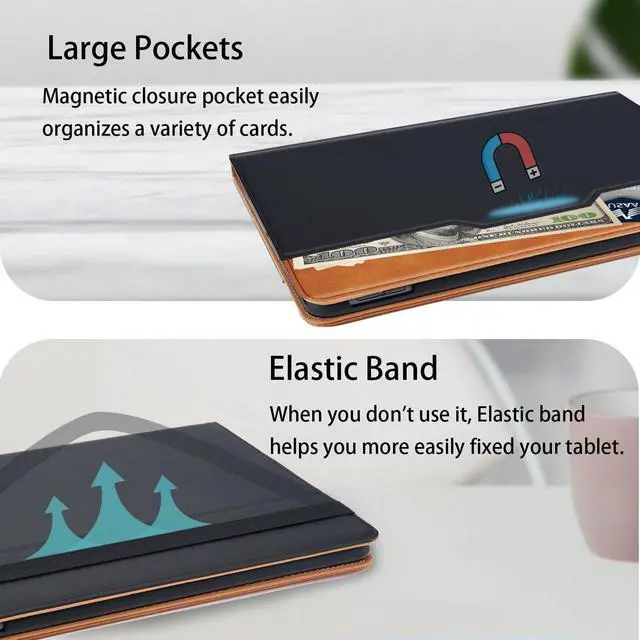 • MULTIFUNCTIONAL: Built-in hand strap makes one-handed use more comfortable. It has a front pocket automatically closed by a magnetic sticker that prevents built-in cards and tickets from falling out. The multi-angle design is convenient for watching movies and reading materials. Elastic strap prevents the tablet case from opening accidentally.