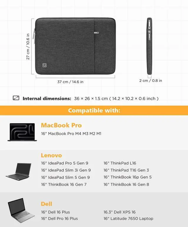 Internal material: Featuring a polyester foam padding layer and soft fluff interior, protect your device against accidental scratched ^^ External pocket Providing additional storage space for smaller items such as your iPad, smartphone, or laptop accessories, and the zipper design won't let it slip off. ^^ Compatible with16" MacBook Pro M4 M3 M2 M1, 16" Lenovo Legion 7i Gen 9, 16" Legion 5i 9i Gen 9, IdeaPad Slim 3i Gen 9, Slim 5 Gen 9, 16" ThinkBook 16 Gen 7, 16p Gen 4 5, E16 Gen 2, L16, T16 Gen 3, Z16, 16" HP Spectre x360, 16" Dell 16 Plus, Dell Pro 16 Plus, 16" Galaxy Book3 pro 360. ^^ Professional & Classic DesignBusiness travel, meetings, college and leisure, stylish and practical companion, Optimal protective bag for equipment and accessories. If you are not satisfied with NIDOO laptop bag, please do not hesitate to contact us. Provide friendly 7x24 hours customer service Kindly and solve your problem in the best way.