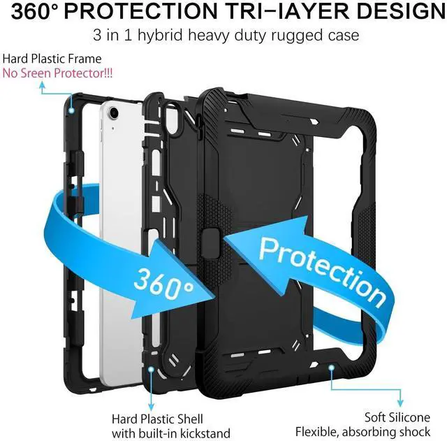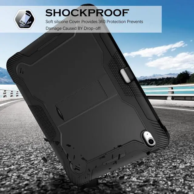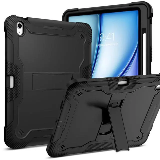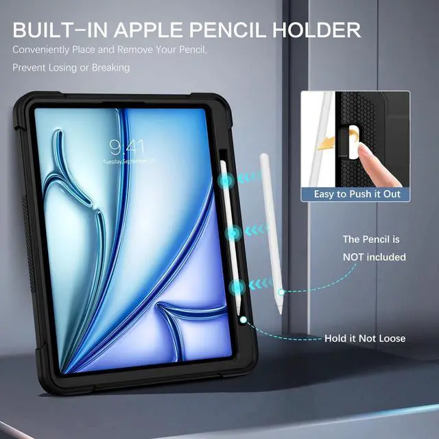 Product Features: Sturdy and feels good to the touch. Built-in Apple Pencil Holder for handy usage and storage. (Pencil Not Included) Raised border around the screen, WITHOUT built-in screen protector. A silicone exterior cover with two interlocking plastic pieces, easy to install and disassemble. 3 layers provide awesome protection for youriPad Air 13 Inch tablet from kids or something big and bulky. Built-in kickstand is well supported, can be folded, won't take up space. Textured rubber surface protect iPad Mini6 from slip, stratches and fingerprint. Cute port cover helps to protect the tablet from dust and extend the service life. Openings for power, earbuds, camera etc are all precise positioned without obstruction.