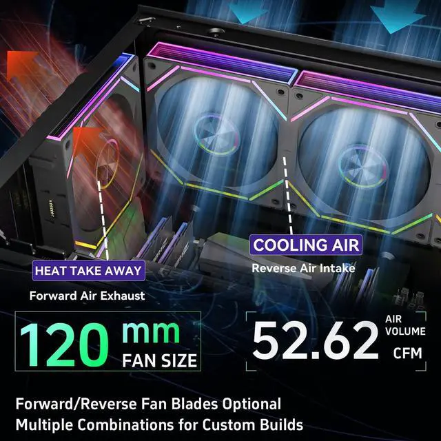 PWM technology: high-speed for rapid exhaust during gaming, low-speed for quiet operation in office. Equipped with 8 black shock-absorbing silicone pads and a premium motor, it runs at 32.45 dBAensuring efficient heat dissipation without noise. ^^ High Airflow for Exhaust ScenariosWith 52.62 CFM airflow, the reverse blade efficiently expels hot air from the chassisideal for rear/top installation to prevent heat buildup around CPUs/GPUs. It also pairs well with radiators (AIO coolers) to pull heat away from the radiator surface, improving cooling efficiency. ^^ Compact Package for Flexible BuildsThe package includes 1 matte black 120mm fan, 4 matching black screws, 1 modular control line (supports splicing). Its ideal for adding a single exhaust fan to existing dark builds or expanding multi-fan setups, no need to buy a full pack.