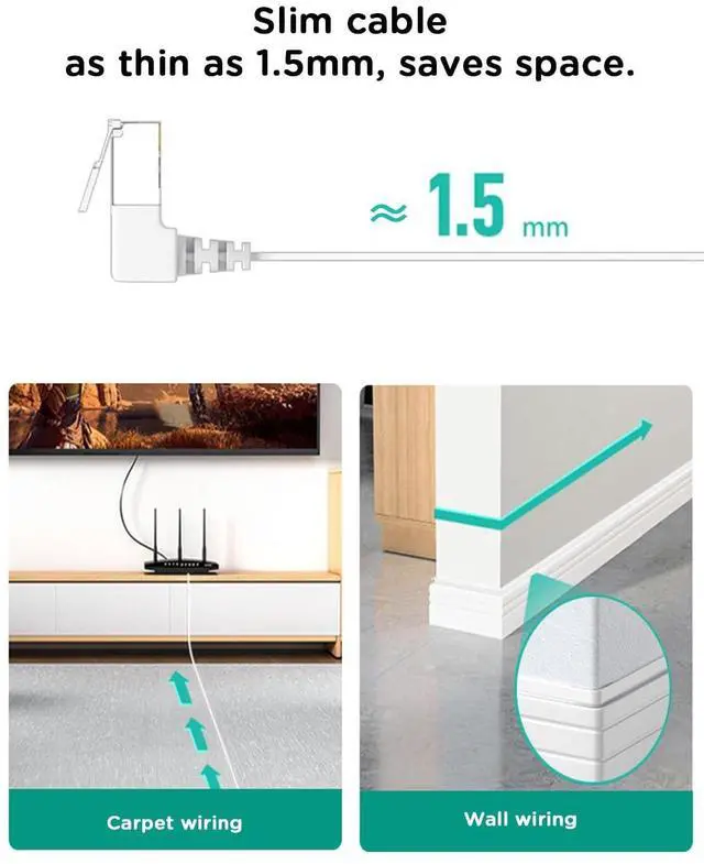90 Degree Right Angle adapter2Pack UPangle and Downangle Right angle Cat6 Ethernet Cable Flat, RJ45 Connector all length only 0.9 inch, Can be better used in narrow spaces, tight fit your laptop or connect to network wall plate behind furniture or couch. Protrusion length is only 0.4 inch ^^ 180 Degree Straight adapterUltra short ethernet connector of Flat cat6 cable has a total length of 0.8 inche and can be bent up or down by any 90 degrees, Compared with other ordinary ethernet connectors, it is more flexible to use. ^^ Beautiful and tidy90 degree ethernet cable flat whitePerfect for the clean look, No more bend in the wire and allows the furniture right against the wall.