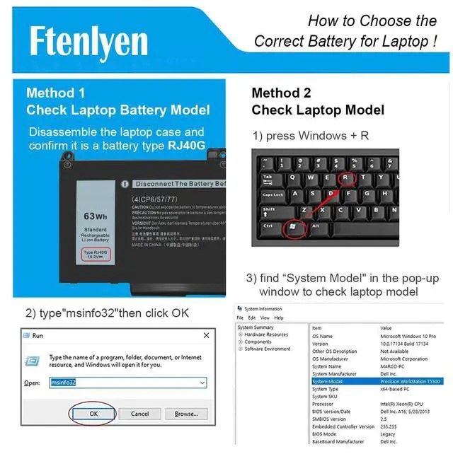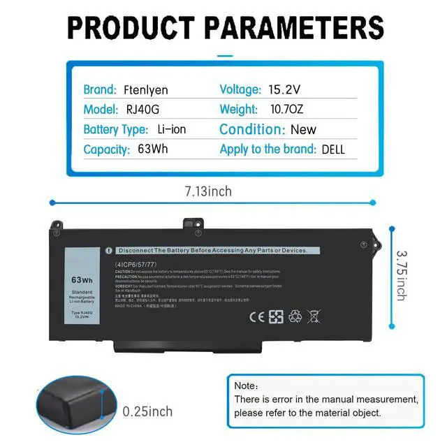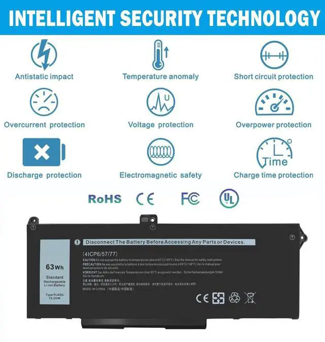 Packages includes: 1x RJ40G Laptop Battery, 2 x Screwdrivers, 1x Instruction ^^ [ Compatible Part Number ] Fits for Dell RJ40G 01K2CF 075X16 WY9DX 0WK3F1 0M3KCN 005R42 RJ4OG ^^ [ Compatible Laptop Models ] Fits for Dell Latitude 14 5420, Latitude 15 5520, Precision 15 3560 series laptops, for Dell P137G P137G001 P104F P104F001 P104F002 series Laptop Notebook ^^ [ Quality Control ] 100% New from Manufacturer. Up to 1000 recharge cycles over the life of the battery! Made of high quality materials, top grade battery cells and packed with safety features. ALL our batteries are Tested under strict quality control standards. CE-/FCC-/RoHS-Certified. ^^ [ Purchasing Note ] There are 2 battery(RJ40G-63Wh and WY9DX-42Wh)of the Latitude 5420 5520 laptop, Please choose the which one you are going to replace and according to your laptop's original battery