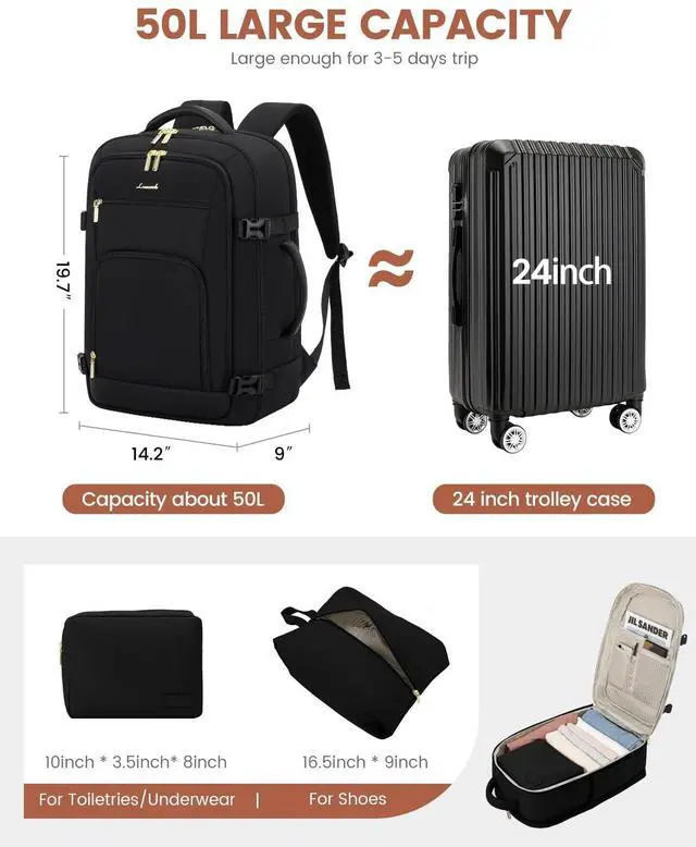 Packing Cubes & Wet Pocket: Our travel backpack for women equipped with 2 carry-on cubes, deal for neatly storing underwear, socks, and small clothes. And equipped one shoe bag with 16.5 inches/42cm long, can hold 1~2 pair of shoes. The high-density waterproof wet pocket is perfect for toiletries and damp clothes, keeping your travel belongings tidy and separated. ^^ Ideal Gift for