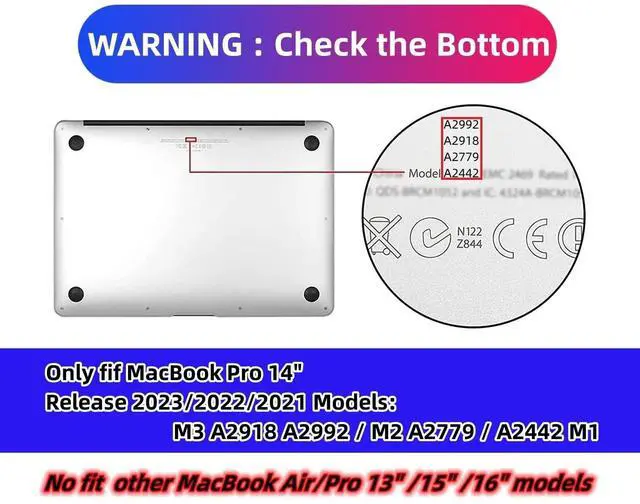 Compatible ModelsONLY compatible with MacBook Pro 14 inch Case(2023/2022/2021 Release Model M3 A2918 A2992/M2 A2779/A2442 M1 Pro Max Chip with Touch ID). Not compatible with other Mac Air Pro Laptop models. ^^ Friendly Reminder Before your purchase please kindly check the model number "Axxxx" on the back of the Laptop. make sure you choose the exact same model number as the listing title stated "A2442"or"A2779"or"A2918"or"A2992". ^^ Stylish & durable Slim, pretty, stylish, practical and durable. The protective case is made of high-quality plastic, non slippery texture, Does not show finger printsPerfect fit, make your Mac Laptop look like new.