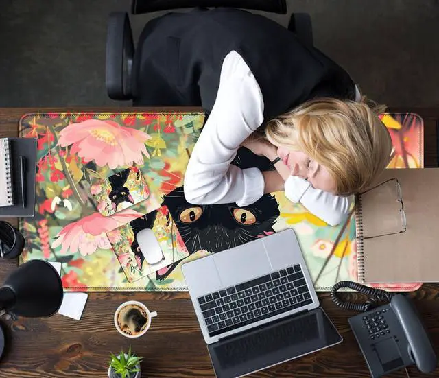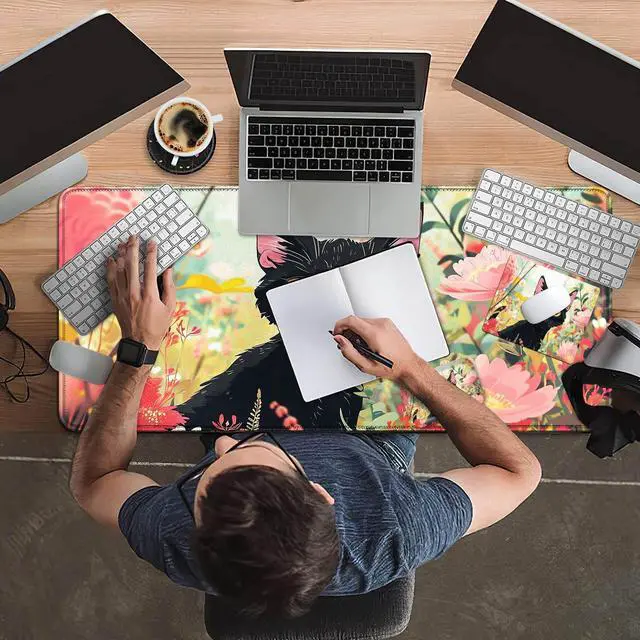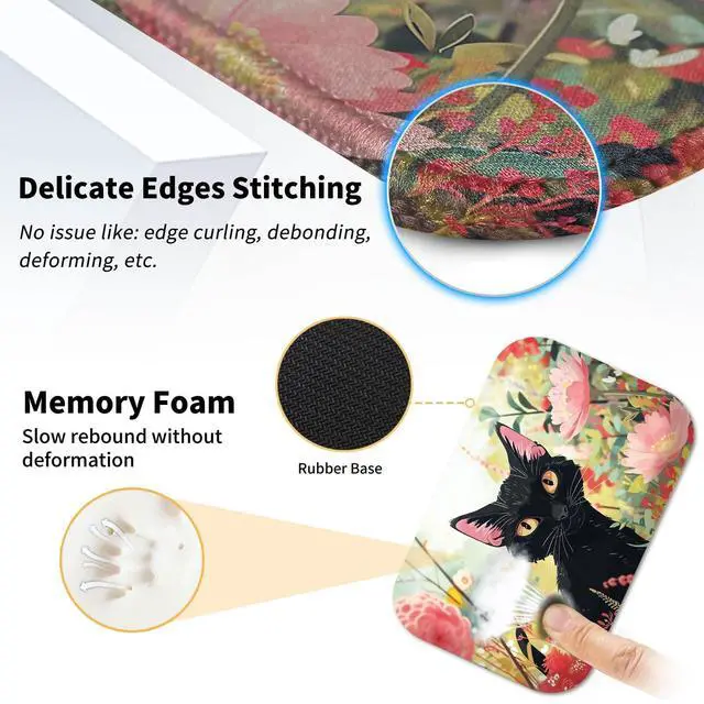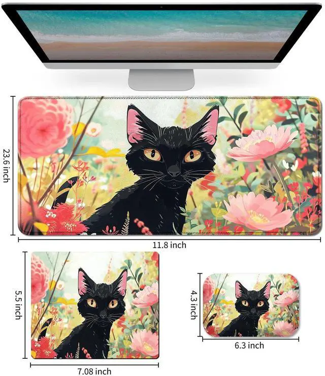 Mouse Pad Desk Mat Ergonomic Wrist Support Pad Set,Mouse Wrist Rest Keyboard Pad with Stitched Edges and Non Slip Base-Black Cat Pink Flowers Cartoon