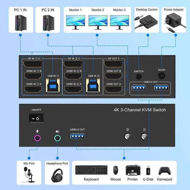 Power Switch: The kvm switch 3 monitors 2 computers display port is powered by USB cables, and the upgraded 5V power adapter makes the 4K 3 monitor 2 computer kvm switch work smoother and provides more stable recognition when connecting high-power USB devices. When not in use, just turn off the hdmi displayport kvm switch without unplugging the cables