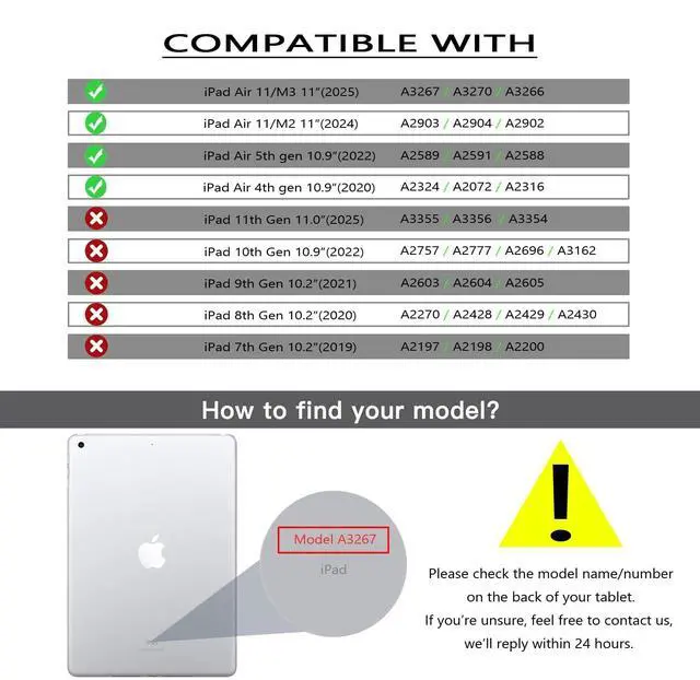 Compatible ModelCompatible with ipad Air M3 7th generation 11 inch (Model: A3266 A3267 A3270), ipad Air M2 6th generation 11 inch (Year: 2024;
