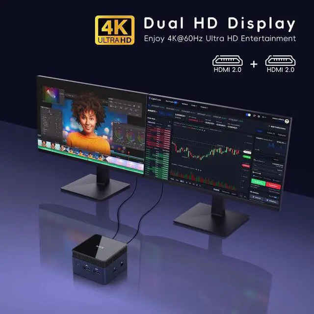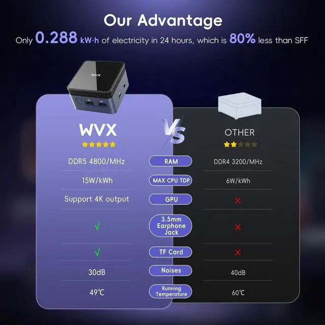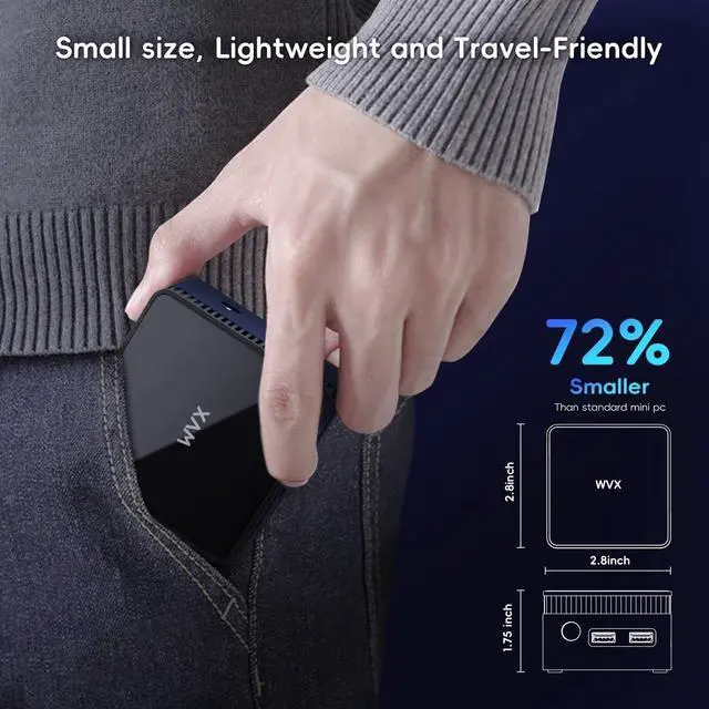 • Upgraded Interface: WVX mini PC with multiple interfaces, 3USB 3.2, 2HDMI2.0 (support 4K), 1* 1000M LAN, 3.5mm earphone jack, type-C Interface power adapter, wif