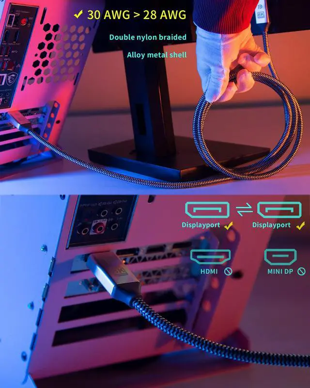 Style: longer Displayport cable male-male30AWG DisplayPort cable 1. 4 HBR3 cable can connect your DisplayPort supported (gaming) PC with an (Ultra) High resolution monitor or other DisplayPort supported device. DisplayPort 1. 4 adds support for display stream compression 1. 2 (DSC), forward error Correction, and extends the maximum number of inline audio channels to 32. DisplayPort connectors provide a secure and dependable connection. Nylon braided wire and alloy metal shell can protect the cable from bending and deformation.