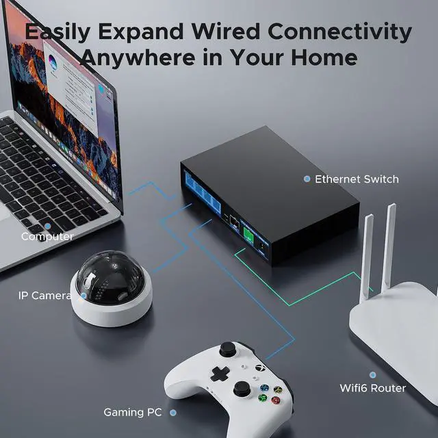 It is designed to manage substantial data traffic efficiently, ensuring seamless network operation. ^^ Experience hassle-free setup with this unmanaged 2.5G bps Ethernet switch. It requires no configuration, offering a genuine plug-and-play experience. Just connect the power and Ethernet cables, and you're ready to go. ^^ Encased in a durable metal housing, this switch promises exceptional durability and efficient heat dissipation. Its fanless design guarantees silent operation, making it an excellent choice for environments sensitive to noise. ^^ This switch is versatile and fully compatible, making it ideal for 2.5G NAS, 4K video playback, gaming PCs, 2.5G Servers, 2.5G APs, 2.5G PCIe Adapters, and more.