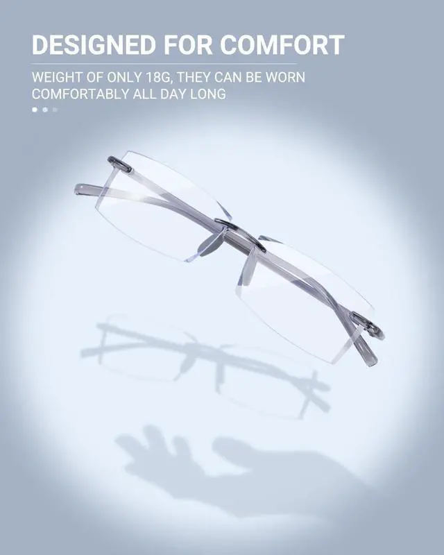 Reading glasses designed for comfort, Zero pressure even after long hours - comfort is the most important thing. ^^ Designed for comfort - With a weight of only 18g, they fit well and can be worn comfortably all day long. ^^ Added comfort - High quality TR90 frame is ultra-light with a textured feel and a great fit, while the one-piece silicone nose pad does a super job at improving comfort and preventing sliding. ^^ Fashion Rimless Reading Glasses - This pair redefines what reading glasses should look like with its minimalist frameless, displaying a whole lot of personality and charm.