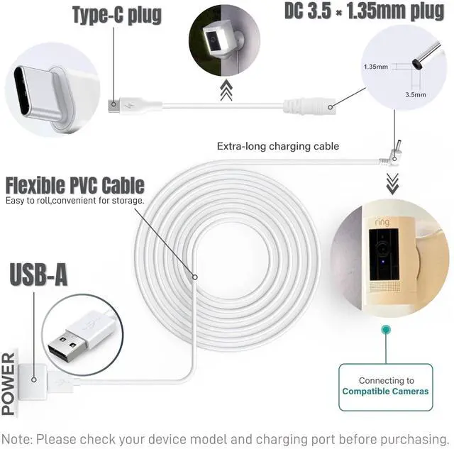 Input: 100-240V 50-60Hz. ^^ weatherproof Made with High-Quality PVC Material, ensuring the camera functions properly even in outdoor rainfall. 13.1 ft/4m long cord, which can be installed outdoors through windows or door to avoid using outdoor outlets. ^^ Superior SafetyFlame-retardant exterior shell and built-in safeguards to protect against overheat, overload, over-charging, short-circuit provide ultimate protection for you and your devices. ^^ NoteNo indicator when charging; But you'll notice that the battery level on the APP increases after an hour.