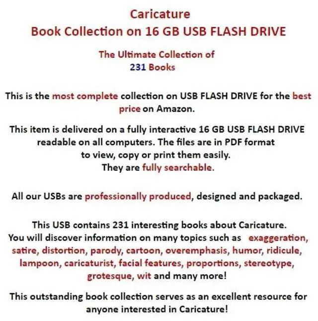 Caricature Book Collection on 16 GB USB FLASH DRIVEThe Ultimate Collection of 231 BooksThis USB contains 231 interesting books about Caricature. You will discover information on many topics such as exaggeration, satire, distortion, parody, cartoon, overemphasis, humor, ridicule, lampoon, caricaturist, facial features, proportions, stereotype, grotesque, wit and many more! Many illustrations can be found and explored! This item is delivered on a fully interactive 16 GB USB FLASH DRIVE readable on all computers. The files are in PDF formatto view, copy or print them easily.