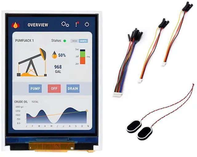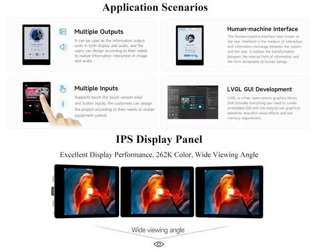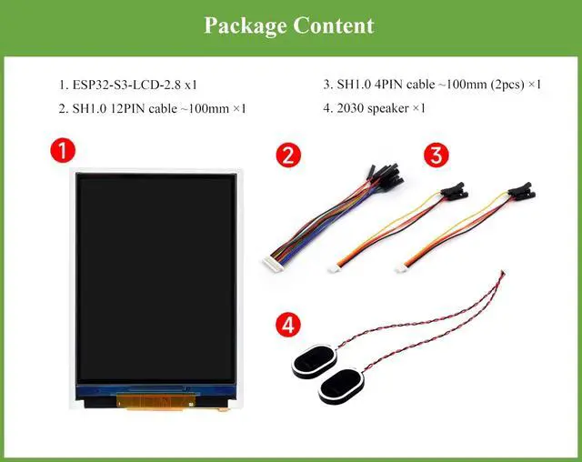 ESP32 Development Board with 2.8 inch LCD display, 240320 resolution, 262K color, IPS Display Panel. Excellent display performance, 262K color, wide viewing angle. ^^ Equipped with high-performance Xtensa 32-bit LX7 dual-core processor, up to 240MHz main frequency. Supports 2.4GH z Wi-Fi ( 802.11 b/g/n) and Bluetooth 5 (LE), with onboard antenna. ^^ Built-in 512KB SRAM and 384KB ROM, with onboard 16MB Flash and 8MB PSRAM. Adapting UART, I2C and some IO interfaces, integrates full-speed USB port. ^^ Onboard speaker, QMI8658 6-axis sensor, RTC sensor, TF card slot and battery recharge management module, etc.