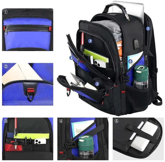 Ergonomic Design: The ergonomic design of this 17 Inch laptop backpack ensures it comfortable to wear even with all your gear loaded. The travel backpack comfortable breathable straps help relieve shoulder pressure. This school backpack with a sturdy handle on the top for carrying, side compression straps keep the carry on backpack at you requires. luggage straps makes it easy to attach your backpack to the luggage trolley, making your travels more convenient ^^ USB Port &
