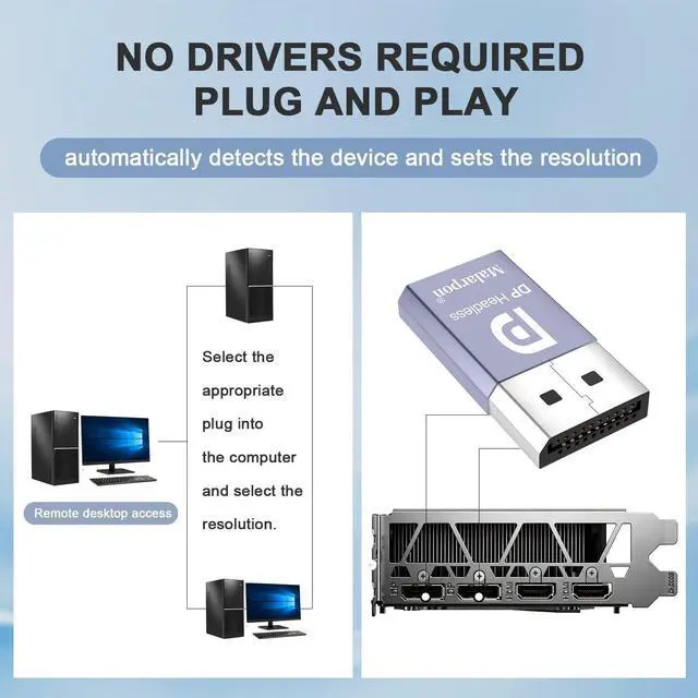 The DP dummg Used for creating a second virtual desktop in VR. Worked well at 1440p Resolution, The screen 'resolution' can be set at many arbitrary configurations up to 8K ^^ Get hardware accelerated Remote Desktop thru moonlight game streaming without needing a monitor Plugged into the machine Work to see 2 monitors through TeamViewer on a headless PC and these worked great ^^ Can remote into a desktop without a monitor for work and it was always reverting to an the old square display ^^ Configuration or power supply just set Design No drivers, no configuration, no power cable - just set and forget Allows for high works with OSX, Windows, Linux and just about anything else ^^ No drivers or config needed download any software or configure the unraid server just plug in adjust Resolution and connect.