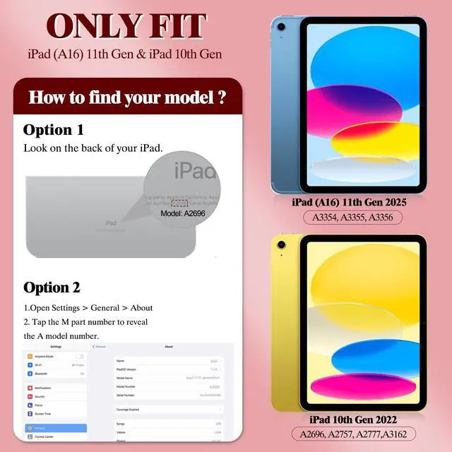 • ONLY COMPATIBLE WITH : Specially designed for iPad A16 11-inch(11th gen 2025) (Model: A3354, A3355, A3356),iPad 10th gen (10.9-inch 2022) (Model: A2696, A2757, A2777). Will NOT fit other devices. Please confirm your model before ordering