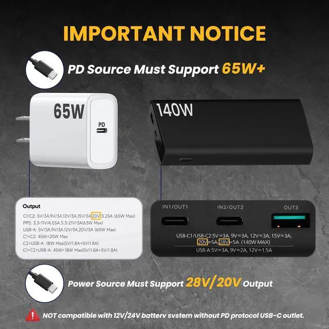 Powerful Protocol Chip: STARGEAR Starlink mini cable intergrated with customized smart protocol chip compatible with 28V PPS and 20V PD protocols, when connected to a compatible PD Type-C power supply capable of providing 28V or 20V, this Starlink cable ensuring a 28V or 20V high voltage output on the DC barrel jack. NOTlCE! NOT compatible with 12V/24V batterv svstem without PD protocol USB-C outlet ^^ 140W Maximum