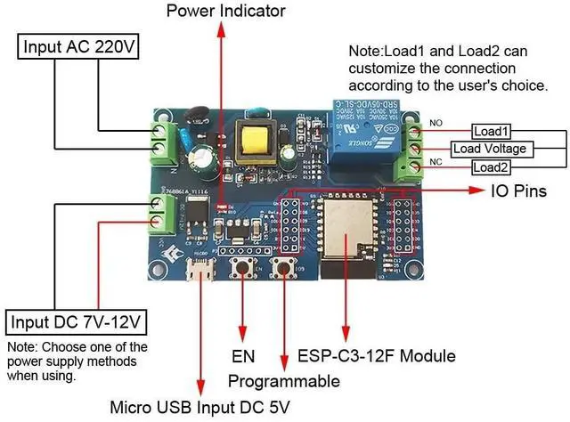 It Is An ESP32-C3 Single-channel Relay Development Board, equipped With ESP-C3-12F Fidelity &BLE Module, all I/O Ports Are Led Out, and Supports AC 90V-250V and DC 7V-12V Two Power Supply Modes. It Is Suitable For ESP32-C3 Secondary Development and Learning, smart Home Control and Other Occasions. ^^ It Uses Mature and Stable ESP-C3-12F Module and Supports Large-capacity 4M Byte Flash. The I/O Port of the ESP3213 Module and the Download Port of the UART Program Are All Led Out, which Is Convenient For Secondary Development. ^^ It Has Onboard AC-DC and DC-DC Switching Power Supply Modules, and Supports Both AC/DC Power Supply Modes.