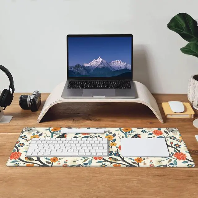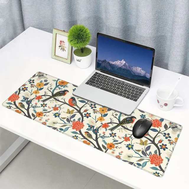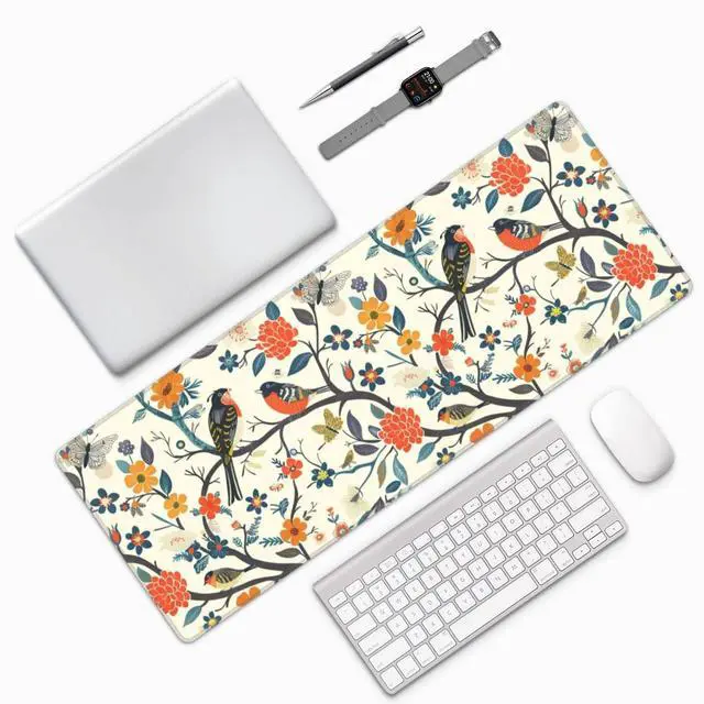 Famame Laptop Mouse Pad Birds and Butterfly Tree Desk Mat with Stitched Edges 31.5X 11.8 inch Non-Slip Large Keyboard Rubber Writing Table Mat for Office Home