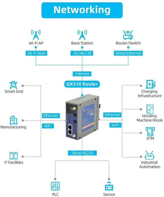 Ethernet Network: Insert SIM card, plug and play (some SIM card may need to follow the manual to set APN). QX310 4G LTE router can share the 4G network with your electronic devices in places without broadband coverage anytime/anywhere. Its 4G LTE CAT4 module supports B2/4/5/12/13/17/18/25/26/41, covering most frequency bands of US (ex T-Mobile and EIOTCLUB, SIM base sim card), NOT FOR Verizon/ATT. Support Canada, Mexico. It is unlocked. ^^ Industrial