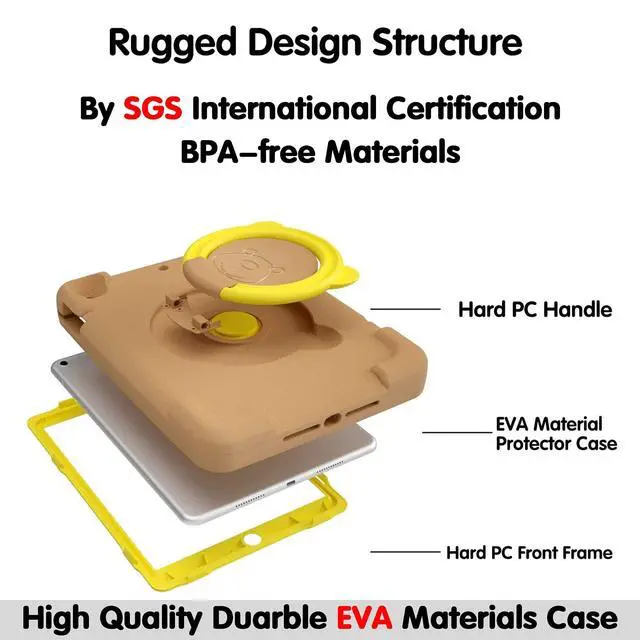 ^^ Design: The 360 rotating +180 folding bracket consists of a cute bear on the back of the case. The multi-function handle is easy to carry, adjust the bracket, and adjust the viewing angle from multiple angles to viewing the media.