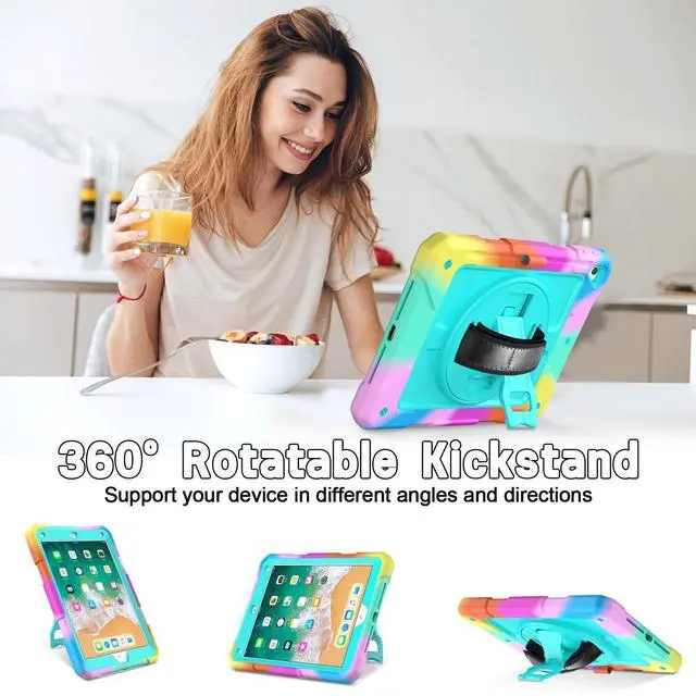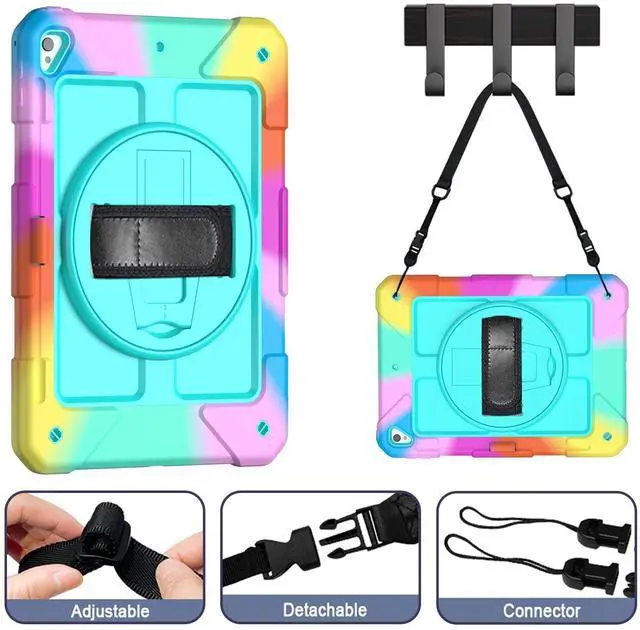 Pro 9.7 inch 2016 (Model: A1673 A1674 A1675) ^^ Super Sturdy - iPad 6th/5th Generation Case 9.7 inch, construct from fine material like silicone rubber and polycarbonate, durable, shock-resistant, gives decent protection for your iPad 6th/5th generation, iPad Air 2 and iPad Pro 9.7" tablet ^^ Great for Grip/Hold - 6th Generation iPad Case 9.7 inch, rugged design, anti-slip surface made it easy to hold, even for little kids, and hand-strap can be easily adjusted according to the size of your hands ^^ Fun and Functional - iPad 6th Generation Cases, colorful, attractive for children, plus it comes with pencil holder, swivel kickstand, hand strap and shoulder strap, allows hands-free viewing in different comfy angles, available on the go ^^ Worth Every Penny - iPad Air 2 case, hang it on the car headrest, set-up the stand in kitchen while cooking, take it to school/gym/picnic/camping/outdoor etc. It can be put to use in many settings, absolutely kid-friendly, great value, decent protection, wonderful gift choice for family and friends