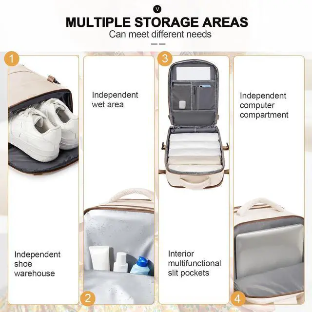 SPACEThe travel backpack has a large main compartment that can hold 4-6 pieces of tops or pants for 2-3 days of outings or business trips. The main compartment of the luggage backpack can be opened 180 degrees, which is convenient for you to put your clothes and store other items. The separate laptop compartment can fit a 15.6 -inch laptop, making it easy to work off-site. ^^ INDIVIDUAL SHOE COMPARTMENT AND WET BAG DESIGNThe wet bag is made of high-density waterproof material, which can help you separate wet and dry items, you can put wet towels, wet toiletries or other wet items into the wet bag.