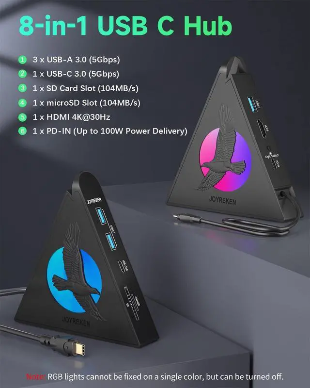 8-in-1 USB-C Multi Port Hub Are you tired of your laptop having too few ports or struggling with unreliable connections? Our RGB USB-C hub solves that problem! It features a USB-C 100W PD-in 85W output, a 4K@30Hz HDMI, a USB-C 3.0 and three USB-A data ports, microSD/SD card slots. It supports high-speed data transfer and fast charging for laptop, making it perfect for work, daily use, or gaming. ^^ Upright USB-C Hub This USB-C hub multiport adapter features an adhesive strip on the bottom for easy attachment to your desk, simply peel off the protective film.